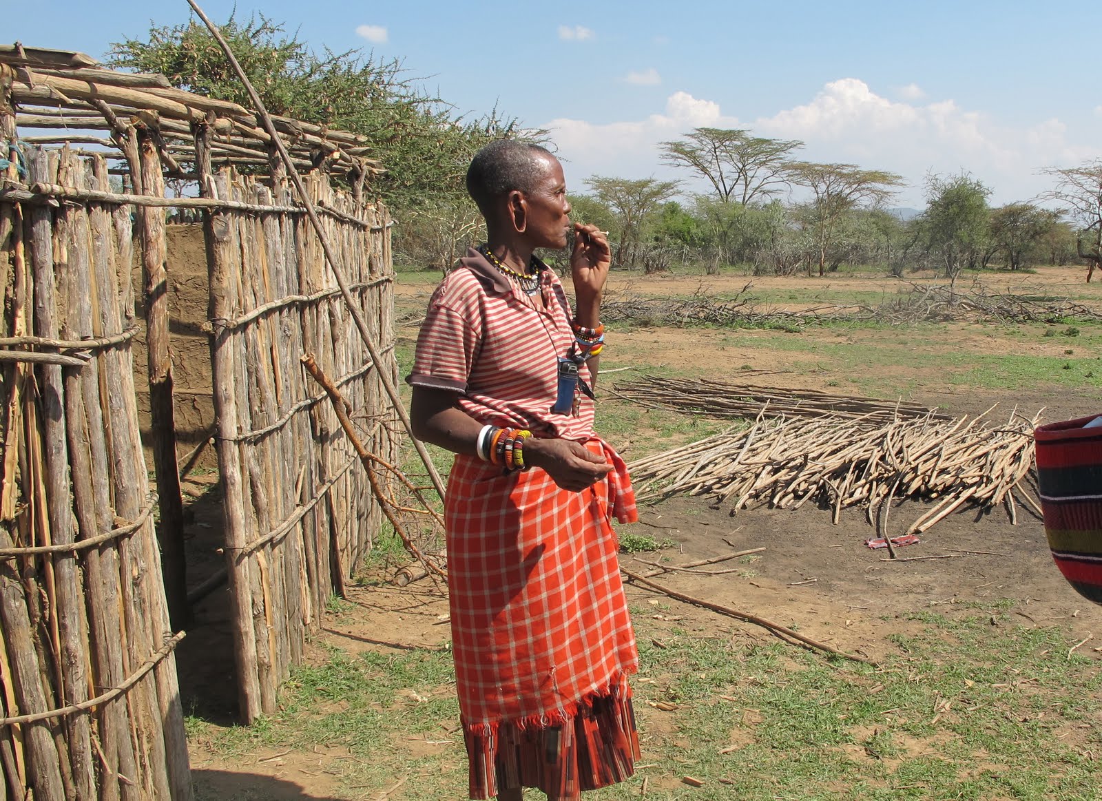 Women build the houses in the Maasai tribe. When we arrived at one manyatta, the matriarch of the community and some other younger women were building a new house. They are made of sticks covered with a mixture of cow dung and mud. Marty helped tie a couple of the roof beams together. These homes are very small